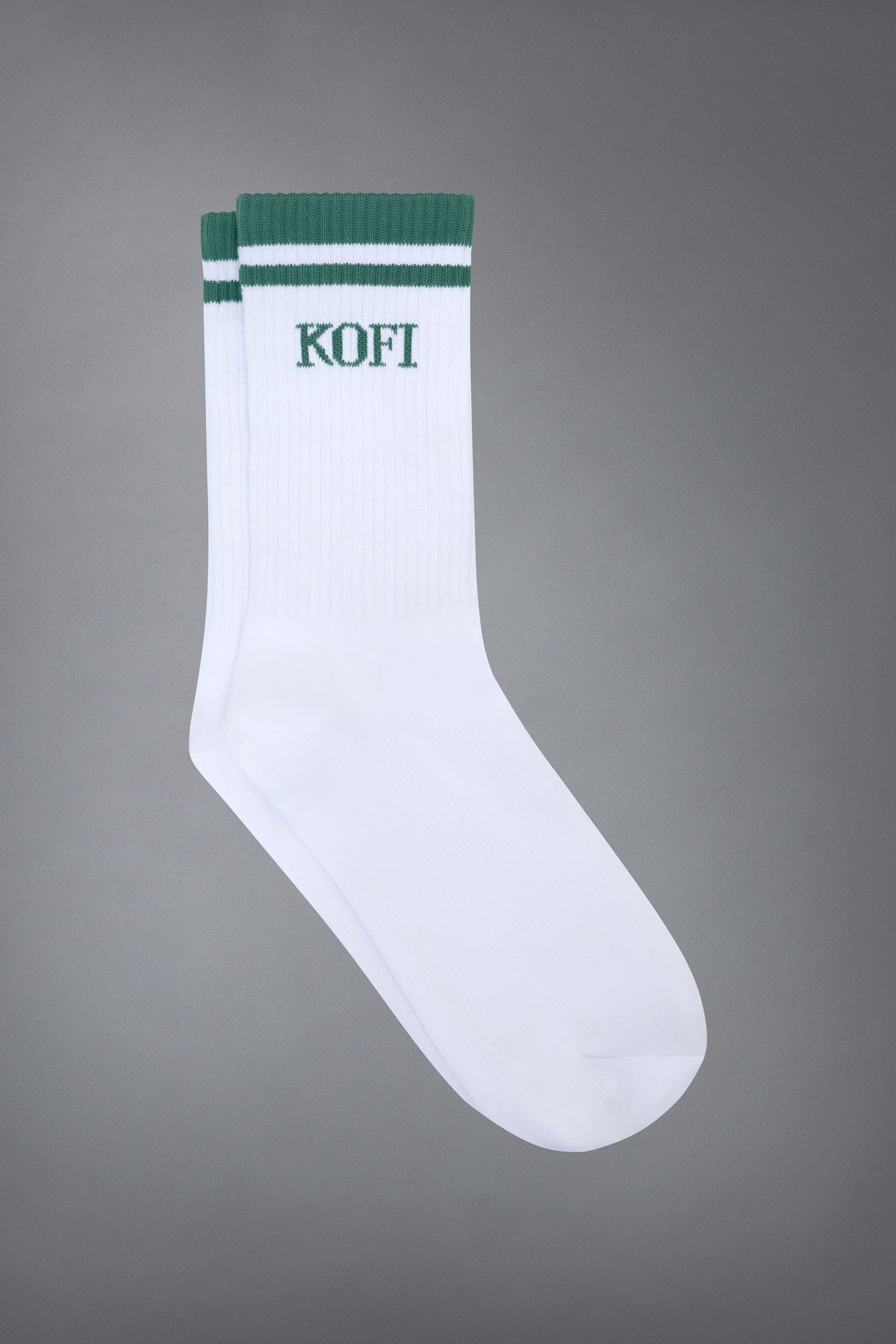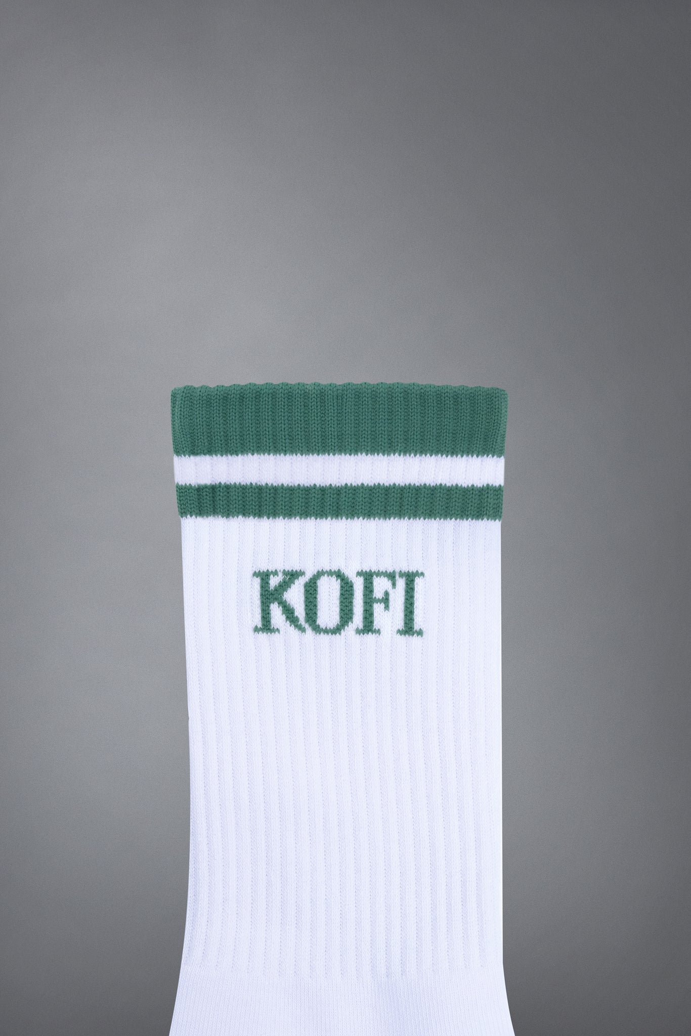 The socks feature a ribbed sportswear silhouette. Crafted in a white cotton blend with contrasting green kofi jacquard band. Very comfortable, the socks will complete any relaxed outfit.
