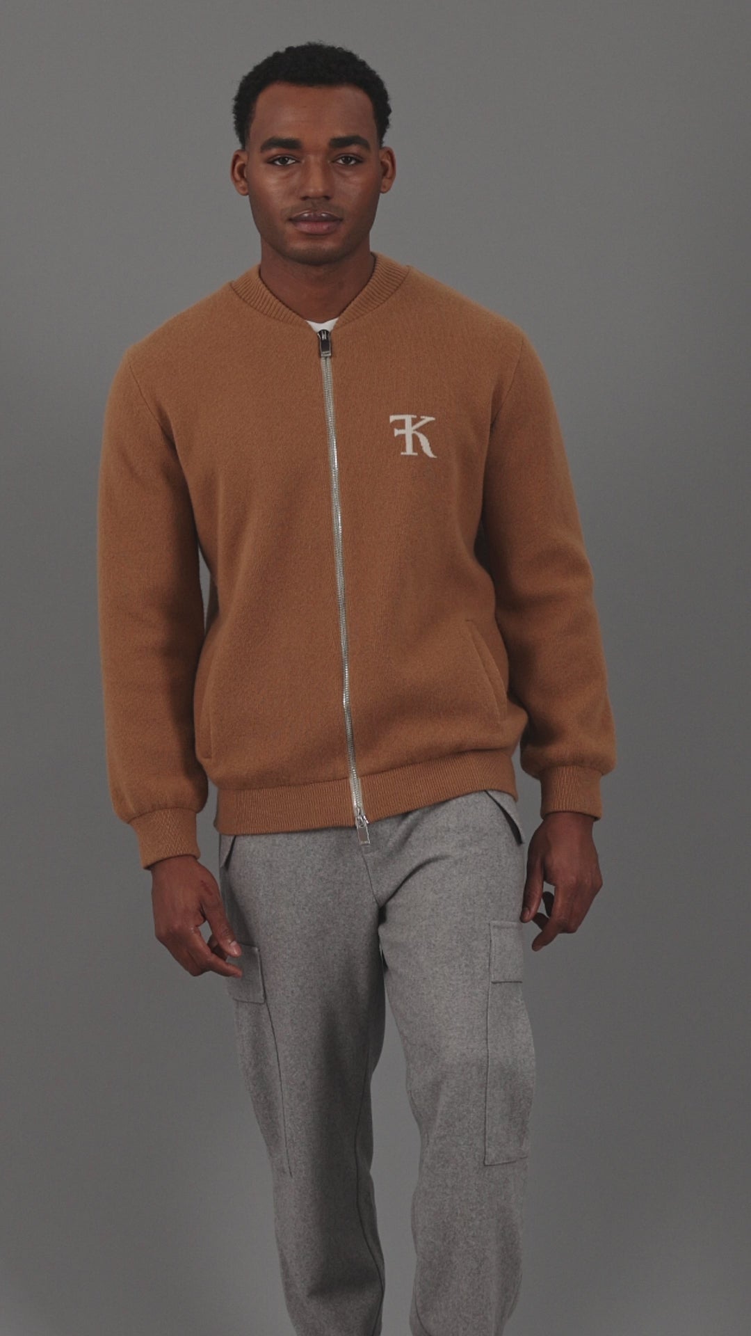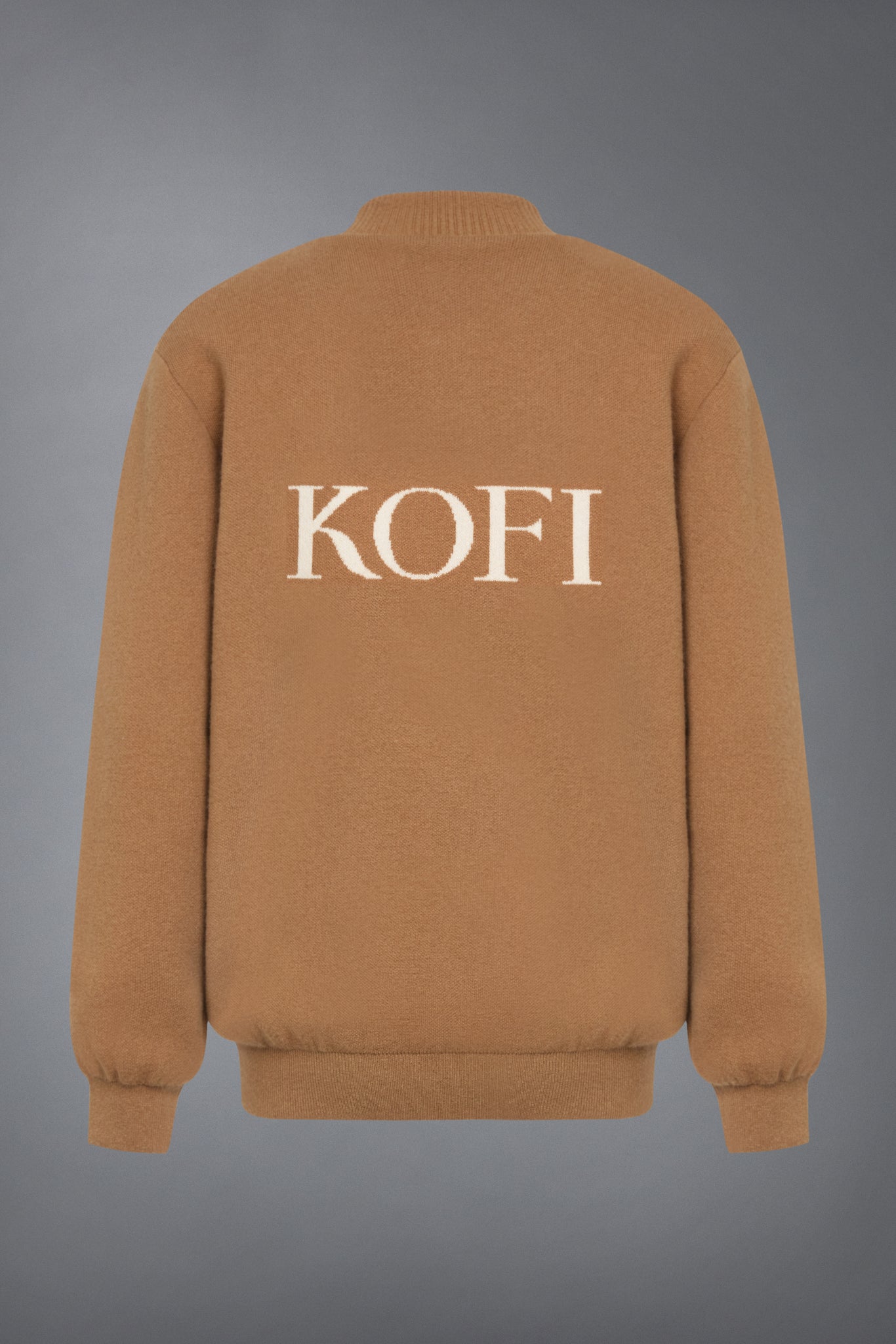 This soft wool cashmere knit bomber is a relaxed comfortable fit. It features KOFI contrasting signature icon on the chest and KOFI signature motif on the back.