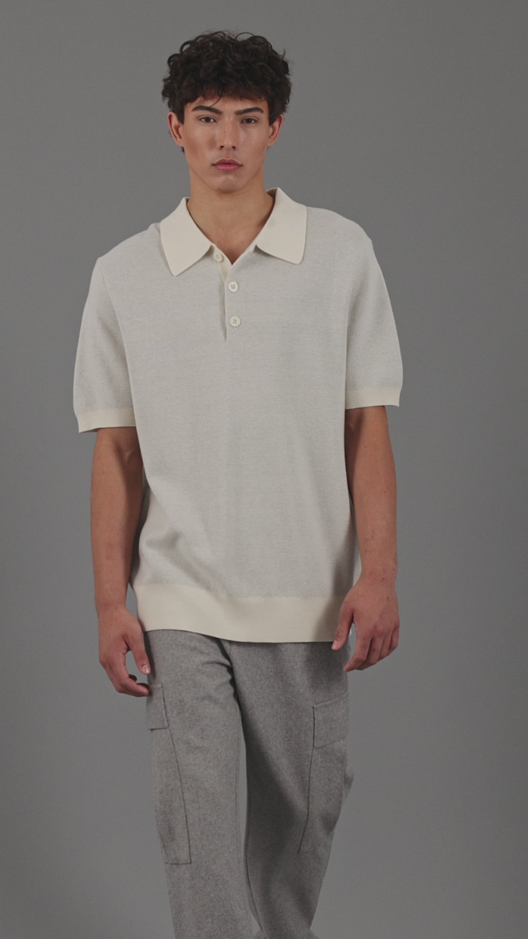 This soft wool-silk blend Polo knit has a relaxed comfortable fit. It features a classic buttoned collar and the KOFI signature motif on the back. This short-sleeved polo will pair effortlessly with KOFI wool cargo pants or casual attire.